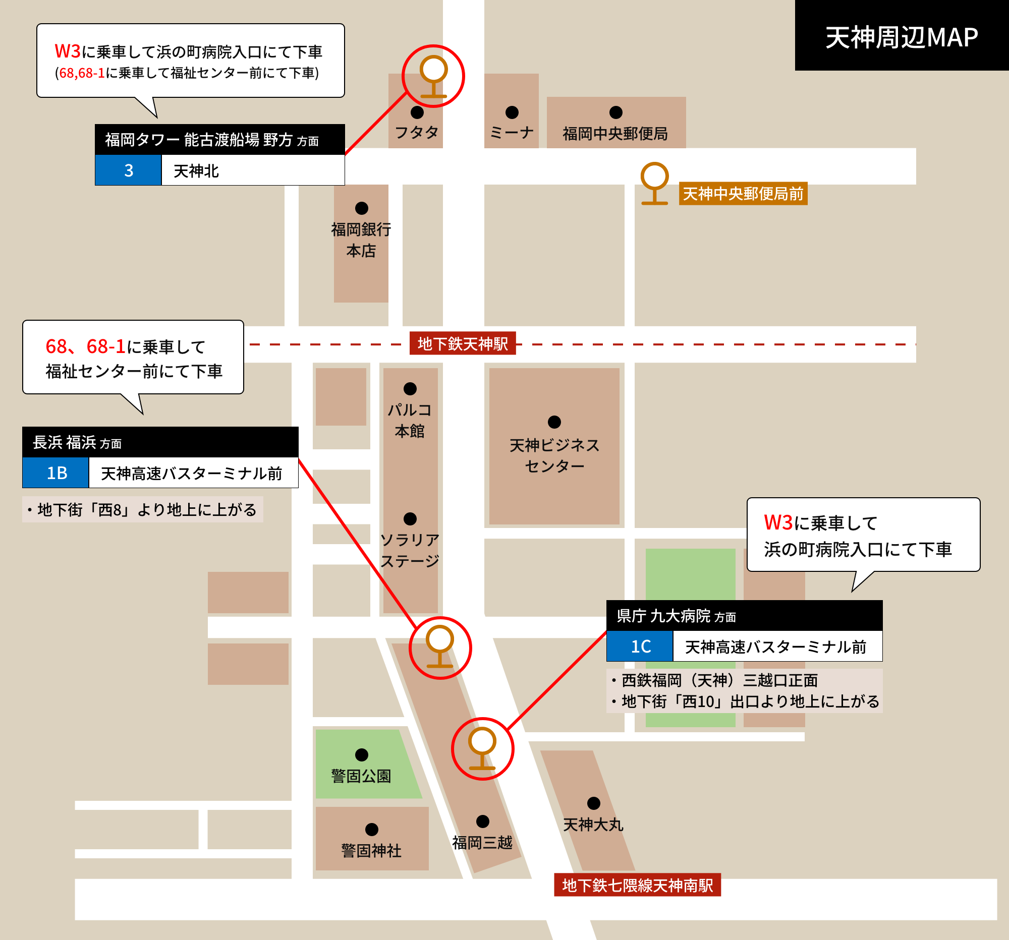※地下鉄空港線「天神駅」から南、地下街「西7」出口へ向かってください。 - 地下鉄七隈線「天神南駅」より 徒歩18分、もしくは「1C天神高速バスターミナル前」停よりW3番に乗車